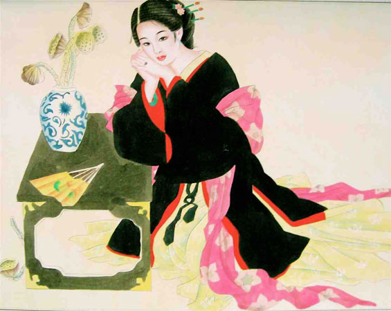Waiting pensively for a customer’s call. Commissioned painting of Healing Tao USA office manager, wearing our required Ming Dynasty office-wear.